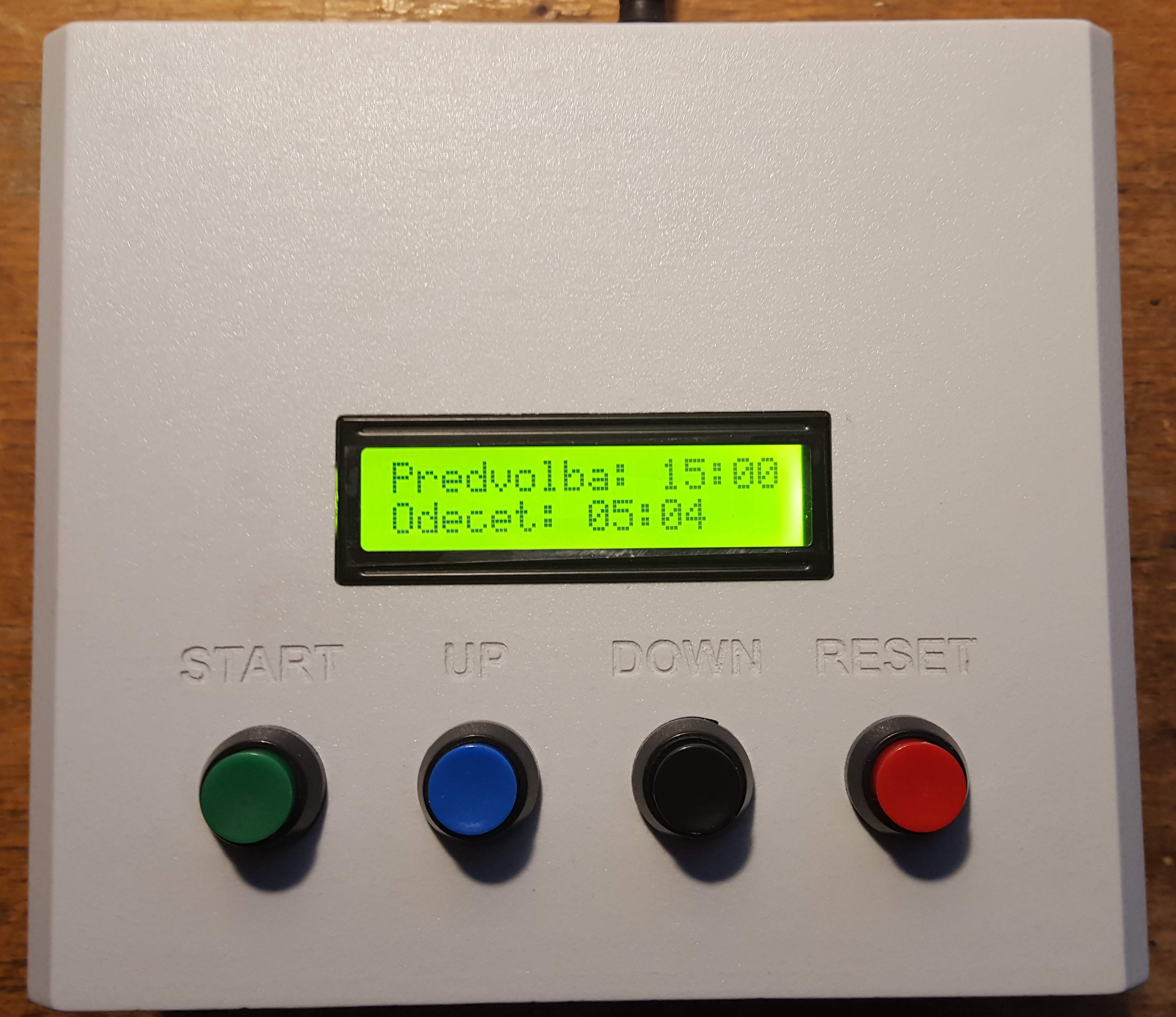 Tyto stopky jsem navrhoval na zakázku. Od všech verzí stopek, které jsem dosud navrhoval, se liší tím, že čas je předem dán a probíhá jeho odpočet. Samozřejmostí je výstup na externí velký displej a možnost uživatelsky editovat 4 přednastavené časy. V této konstrukci byla současně použita procesorová deska Arduino MINI, která celou konstrukci značně zjednoduší a zlevní. Na druhou stranu nelze očekávat žádnou velkou přesnost stopek, ale to u této konstrukce není prioritní.